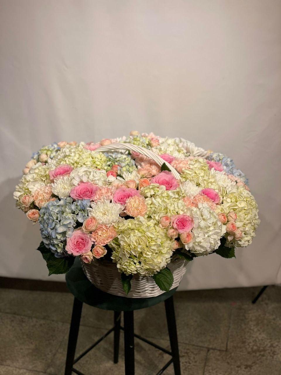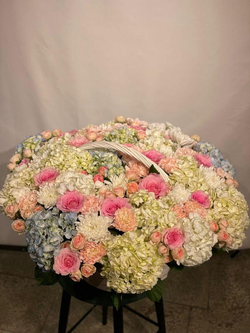 Корзина цветов из гортензии 21шт, роза 50см 19шт, Роза кустовая 23шт, гвоздика 25шт, хризантема 15шт Этот букет — не просто цветы, это эмоция, воплощенная в идеальной форме. Созданный для того, чтобы говорить без слов, он станет незабываемым подарком и подчеркнет исключительность момента. Мы гарантируем безупречную свежесть каждого бутона и гармонию композиции, собранной нашими лучшими флористами. Выбирая этот букет, вы выбираете идеальный способ выразить свои чувства.