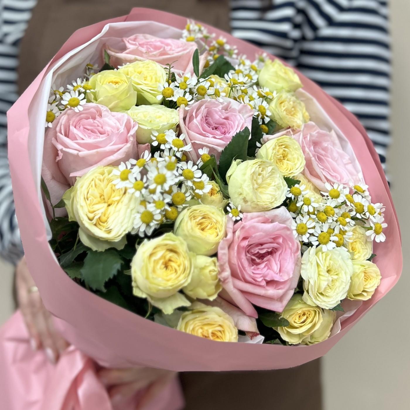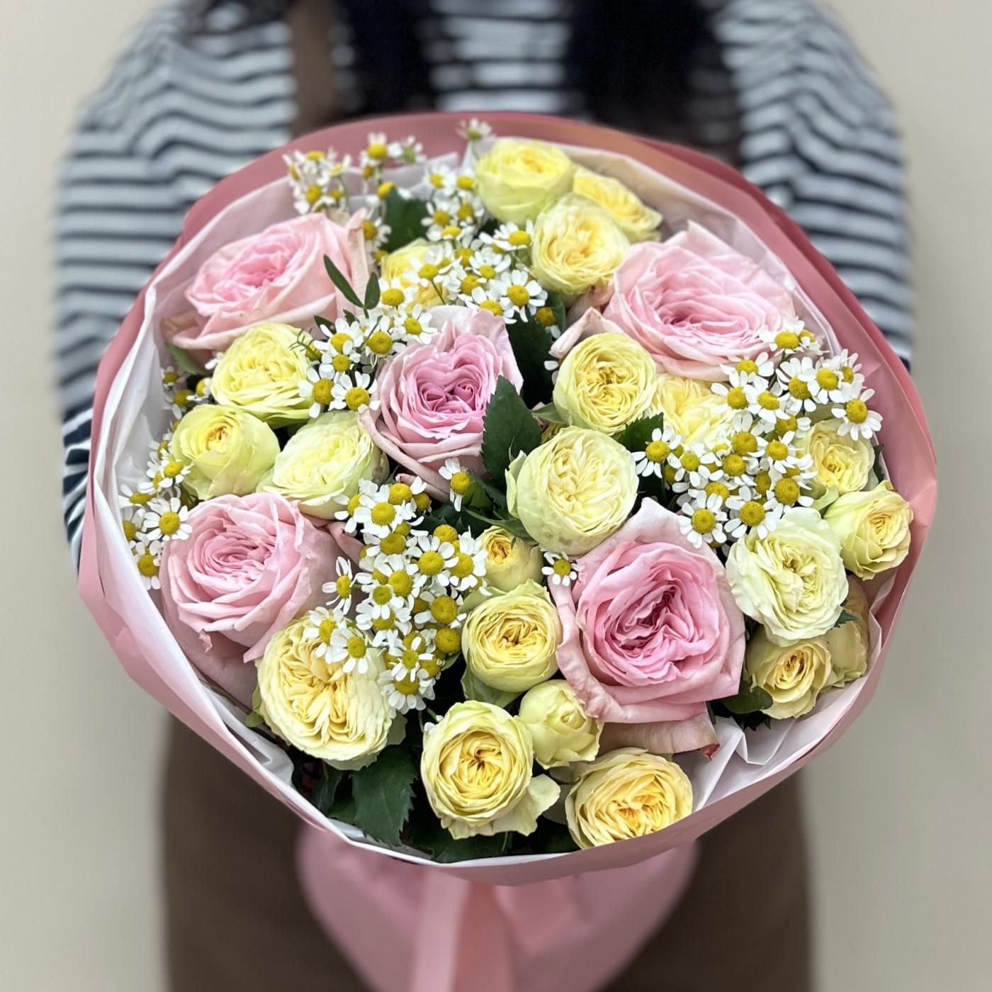 Яркая композиция подарит радость Вашей любимой! Состав: роза кустовая пионовидная -5 шт.танацетум- 5 шт,роза кустовая пионовидная- 5 шт, писташ, упаковка,каркас.