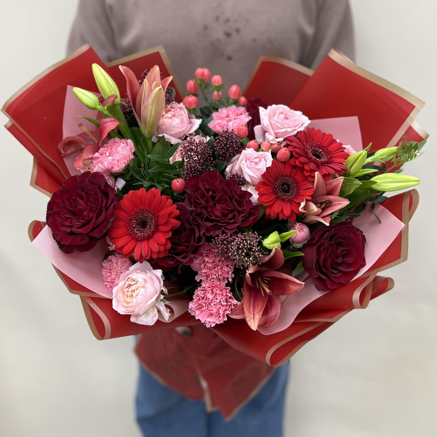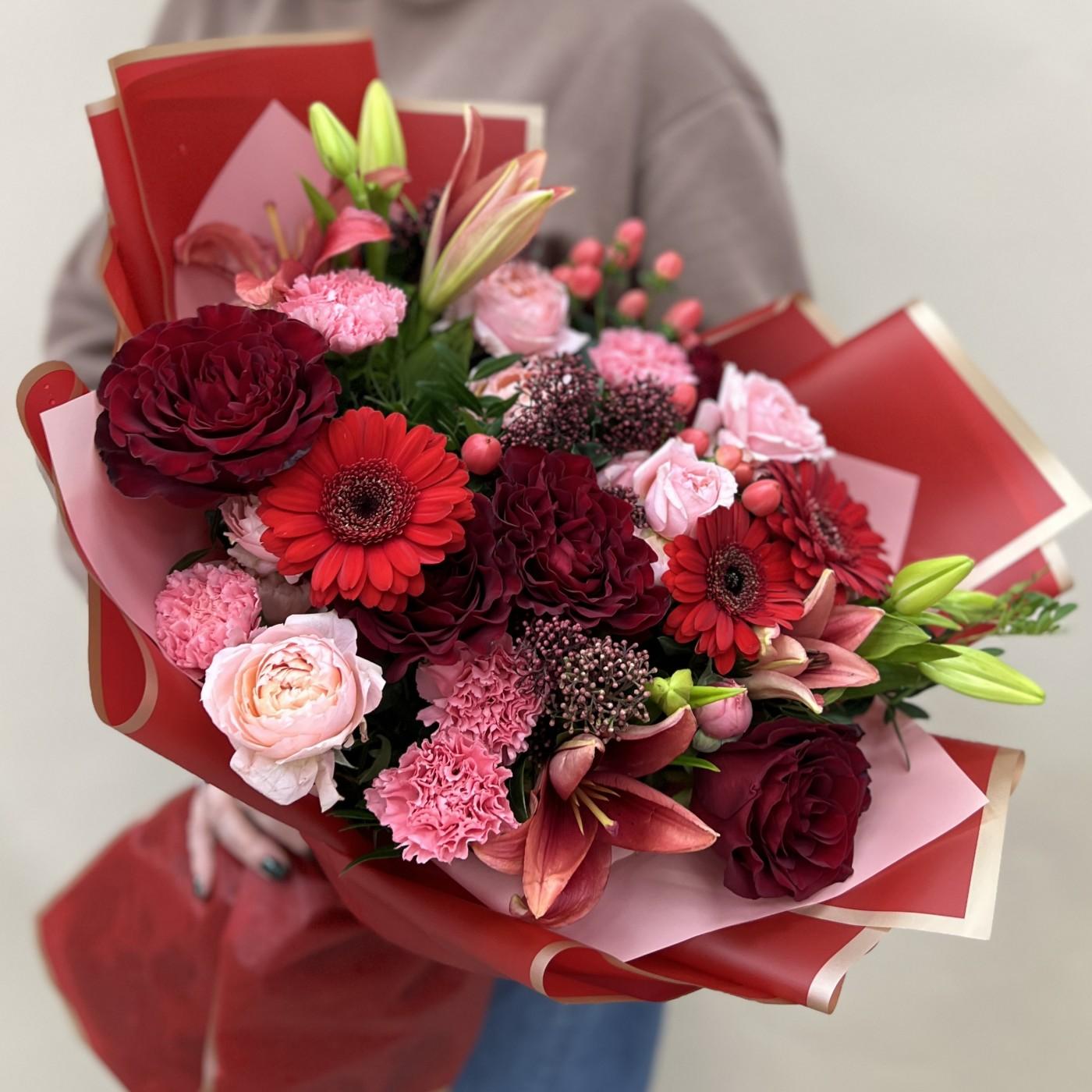 Милый букет для Вашей любимой! Состав;гермини-3 шт,роза пионовидная-5 шт,лилия-3 шт,гиперикум-3шт,скимия-2 шт,роза кустовая пионовидная- 3 шт,гвоздика-5 шт,писташ,упаковка.