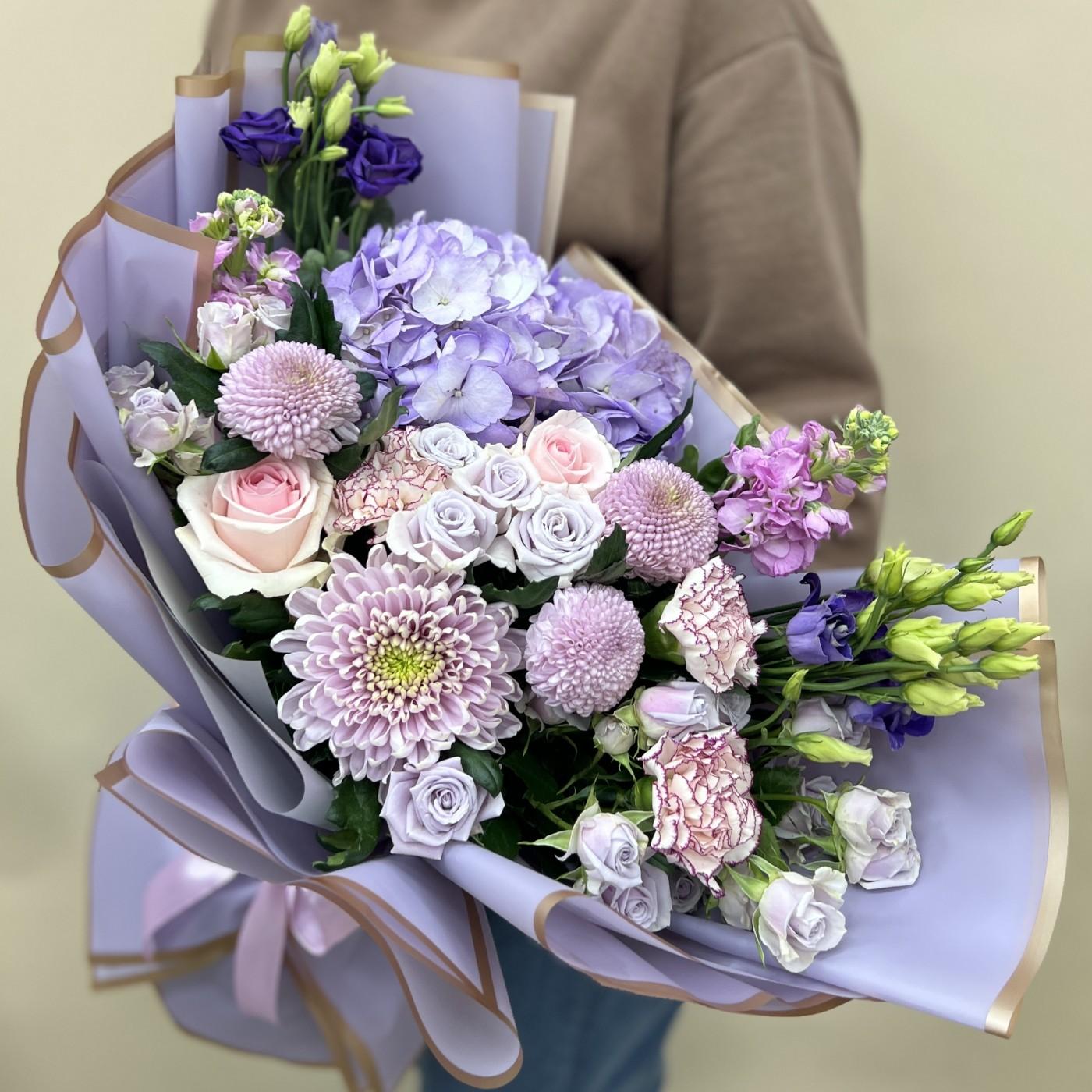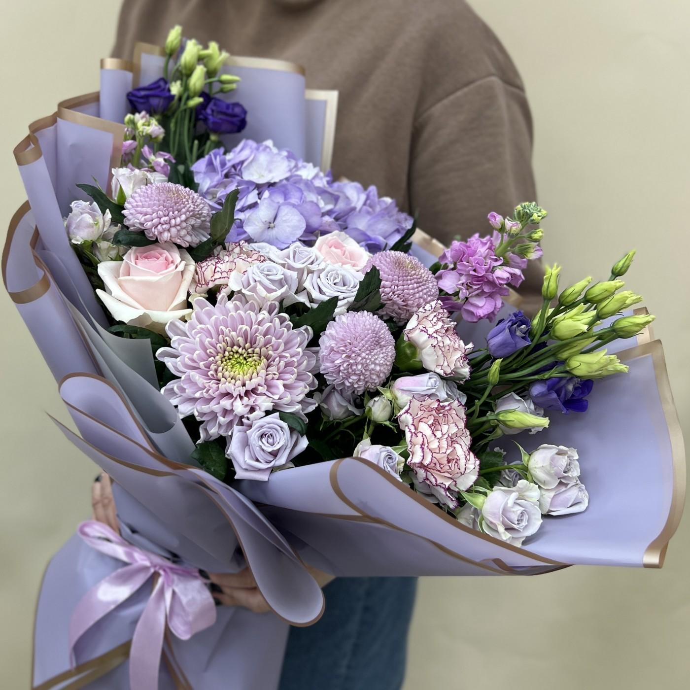 Необычный яркий букет станет приятным подарком для вашей любимой. Состав: хризантема- 4 шт,гортензия,эустома-2 шт,роза- 3 шт,маттиола-2 шт,роза кустовая-2 шт,гвоздика-2 шт,писташ,упаковка.