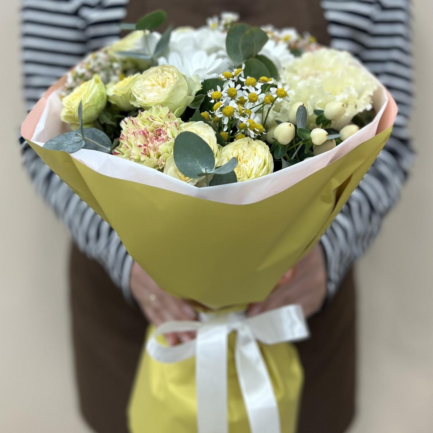 Прекрасный букетик подарит своей получательнице радость и улыбку. Состав: брассика,танацетум-3 шт,хризантема-1 шт,роза кустовая пионовидная- 3 шт,гвоздика,эвкалипт, гиперикум,писташ,упаковка,каркас.